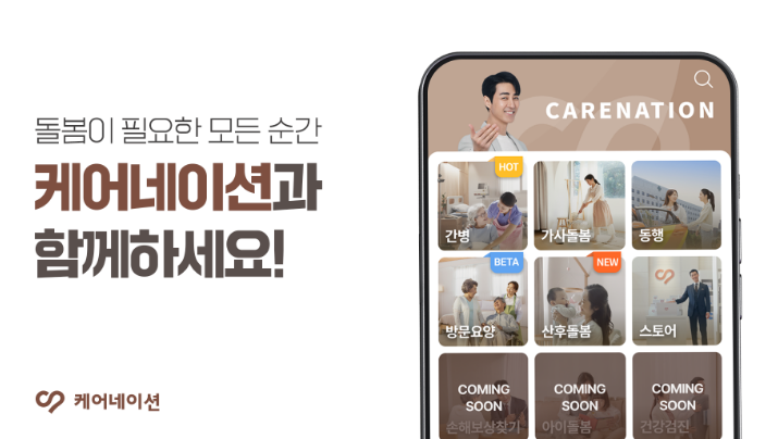 케어네이션 어플을 통해 간병인, 동행 서비스, 가사 돌봄 등의 다양한 서비스를 빠르고 쉽게 찾아볼 수 있습니다.