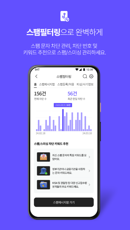 PASS 앱은 스팸 문자 차단 관리 기능을 제공하여, 불필요한 스팸 메시지를 쉽게 차단할 수 있습니다. 또한 차단 번호 및 키워드 추천 기능도 제공하여 사용자에게 더욱 편리한 서비스를 제공합니다.