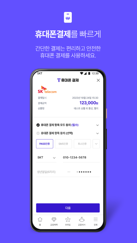 PASS 앱은 다양한 금융상품 정보 및 혜택을 제공하여, 대출, 카드, 보험, 재테크까지 한눈에 확인할 수 있습니다. 휴대폰 결제 한도 조회 및 변경도 가능해, 더욱 효율적인 관리가 가능합니다.