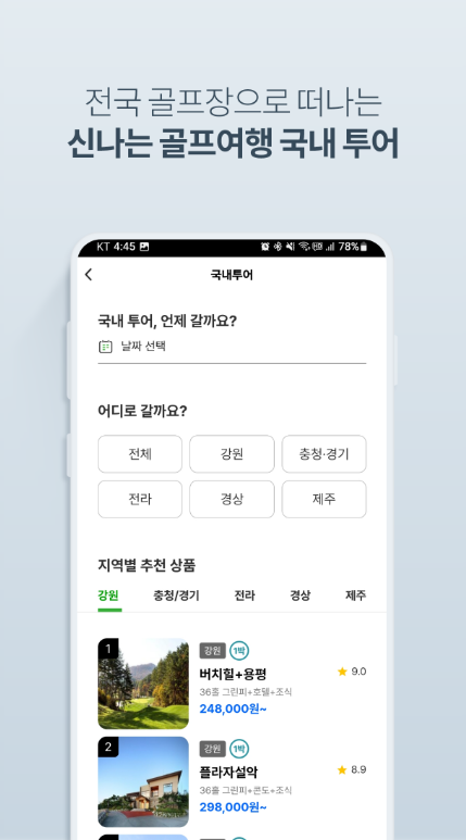 골팡은 300개 이상의 골프장과 해외 투어를 예약할 수 있는 플랫폼입니다. 특가 상품과 1박 2일 패키지, 맛집 정보까지 제공하여 여행을 겸한 예약에 유리합니다. 또한 네이버 카페 운영으로 정보 교류가 활발합니다.