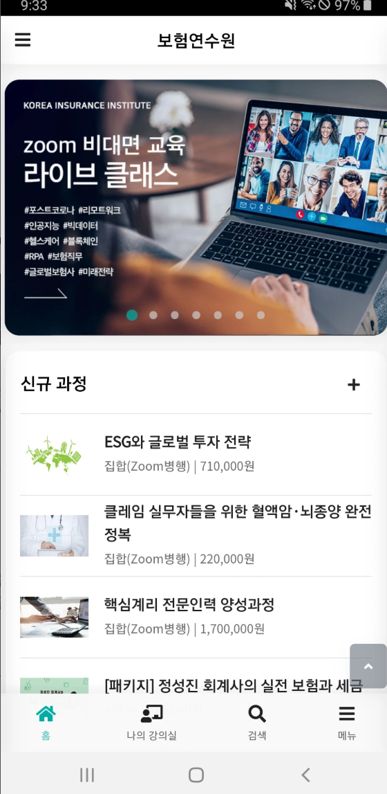 보험연수원 앱은 스마트 기기에서 교육과 자격시험, 교재구매 등 전 과정을 지원하며, 회원편의 중심의 인터페이스로 강의실 관리와 학습 진도 확인을 한 눈에 제공합니다.