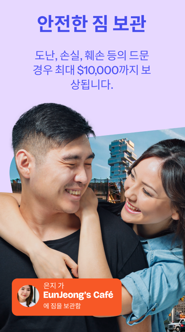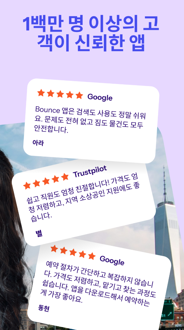 Bounce 앱 어플을 통해 전 세계 어디든 여행 중에도 가볍고 자유롭게 이동하며, 안전하고 편리하게 짐을 보관하세요. 간단한 예약과 유연한 변경, 믿을 수 있는 파트너와 24시간 지원 서비스로 더욱 안심할 수 있습니다.