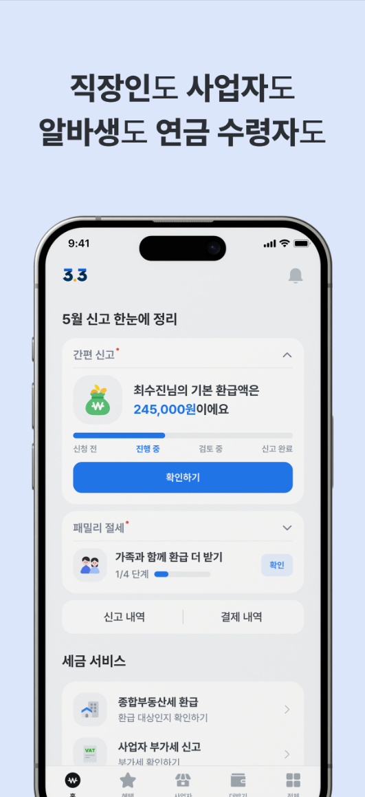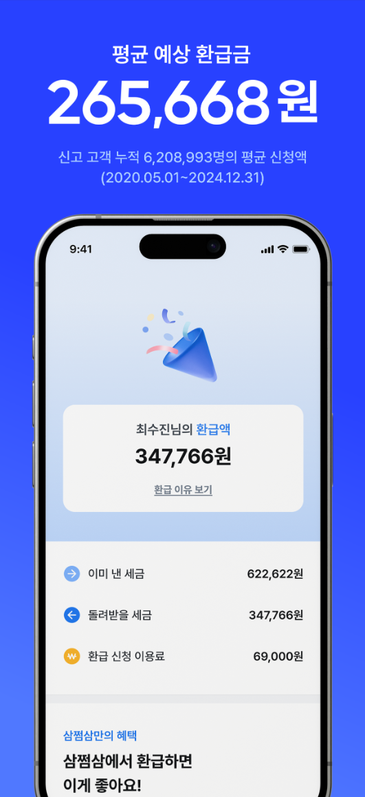 삼쩜삼은 간편한 신고 절차와 맞춤 환급 분석으로 숨은 환급금까지 꼼꼼하게 찾아주는 신뢰도 높은 절세 플랫폼입니다.
