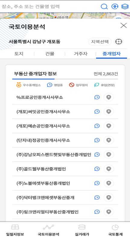 안드로이드 앱의 검색탭에서 도로명 또는 지번을 한 번에 입력해 장소, 건물 이름까지 빠르게 찾을 수 있습니다. 검색 결과는 자동완성 기능을 통해 실시간으로 제안되며, 결과 클릭 한 번으로 지도에 핀이 찍혀 위치 확인이 가능합니다.