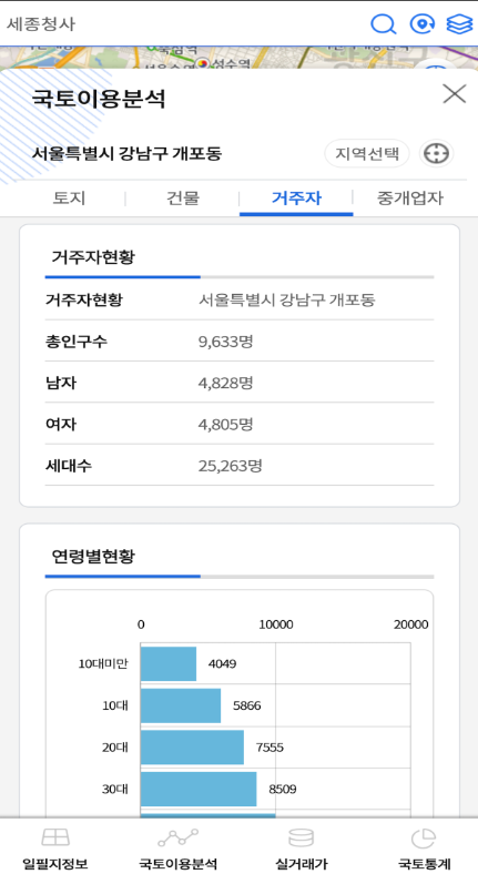 지도에서 지정한 영역을 반경, 폴리곤 등으로 설정해 토지·건물 수와 거주자 통계를 분석할 수 있습니다. 다양한 필터로 특정 유형만 골라볼 수 있으며, 분석 결과를 그래프로 확인해 한눈에 비교 가능합니다.
