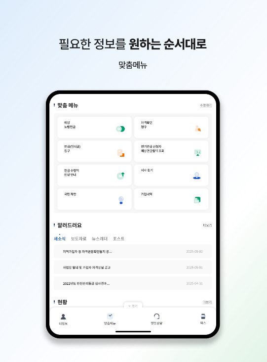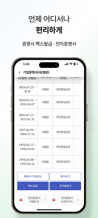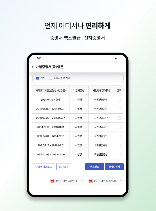 예상연금액 조회와 납부 내역 확인을 한눈에 제공 가입내역 및 납부상태를 실시간으로 조회할 수 있습니다. 연금청구, 부가서비스도 앱 내에서 간편히 신청 가능합니다. 28종의 조회서비스와 30종의 신청서비스를 지원하여 연금 준비부터 청구까지 모든 업무를 모바일에서 처리할 수 있습니다. 전자증명서 발급 기능을 활용하면 팩스나 출력 없이 필요한 서류를 즉시 발급받을 수 있어 효율성이 높아집니다.