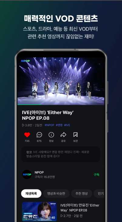 앱 내 ‘보관함’에서는 라이브 다시보기와 클립 영상까지 한눈에 관리할 수 있어 사용 편의성이 뛰어납니다.