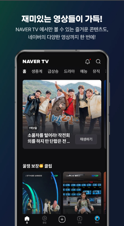 네이버TV 앱 설치 후 다양한 영상과 라이브 방송을 간편하게 즐기고, 관심 콘텐츠를 보관함에 모아 언제든 재감상하세요. 클립 제작과 공유로 커뮤니티 활동도 활성화할 수 있습니다.