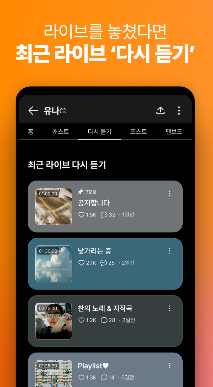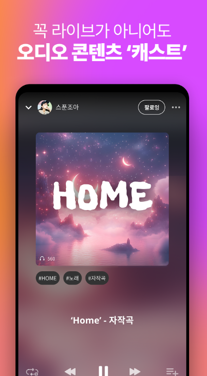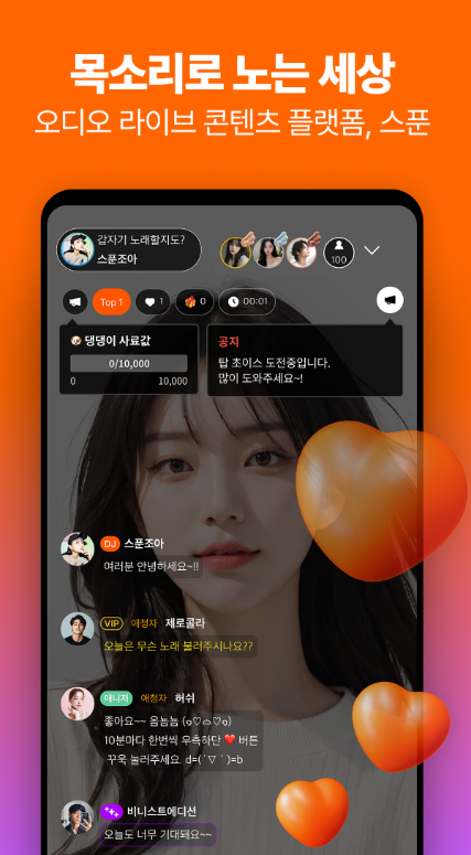 실시간 오디오 라이브는 언제 어디서든 원하는 주제를 선택해 들을 수 있습니다. 채팅 기능으로 DJ와 빠르게 교류하며 방송에 참여할 수 있습니다. 다양한 장르의 토픽이 준비되어 있어 취향에 맞는 콘텐츠를 쉽게 찾을 수 있습니다.