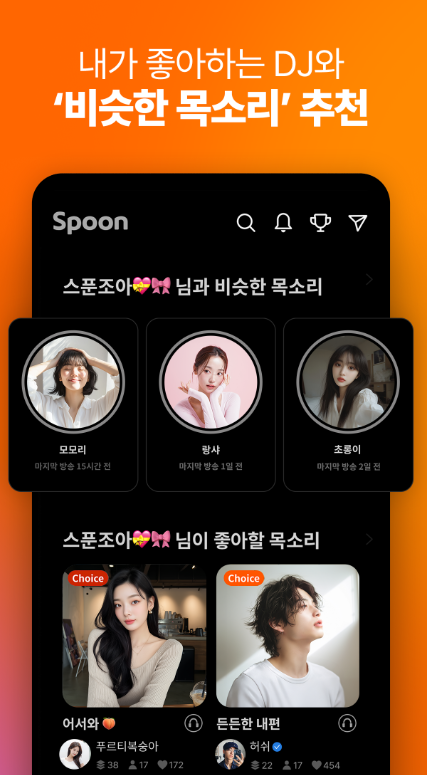 스푼 앱은 실시간 오디오 방송과 AI 추천 기능, 구독 혜택, 이벤트 참여를 통해 새로운 소셜 경험을 제공합니다.