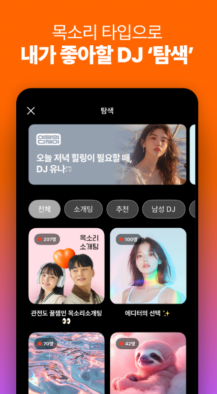 AI 추천은 청취 이력을 분석해 최적의 DJ를 제안합니다. 사용자의 목소리 선호도를 반영해 새로운 콘텐츠를 쉽게 발견할 수 있습니다. 맞춤형 추천 기능으로 매번 새로운 방송과 만날 수 있습니다.