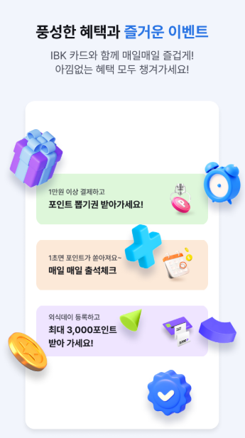IBK카드 앱은 다양한 기능을 제공하여 Card 발급, 사용 내역 관리, 이벤트 참여까지 한 번에 해결할 수 있습니다. 설치부터 인증까지 절차가 단순해 누구나 쉽게 이용할 수 있습니다.