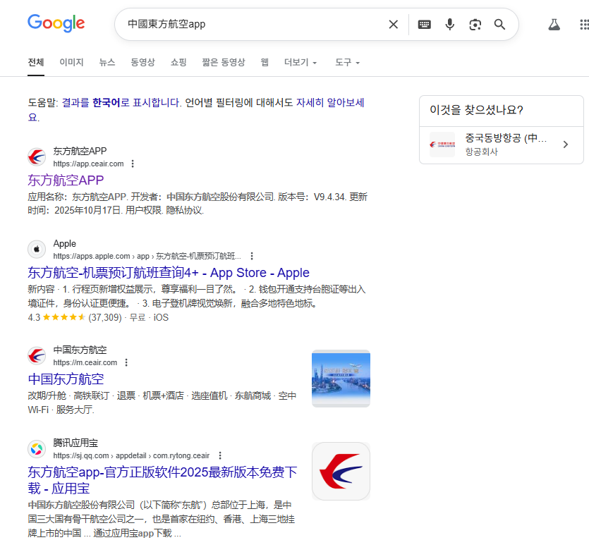 Q. 한국에서 중국동방항공 앱이 검색되지 않아요.