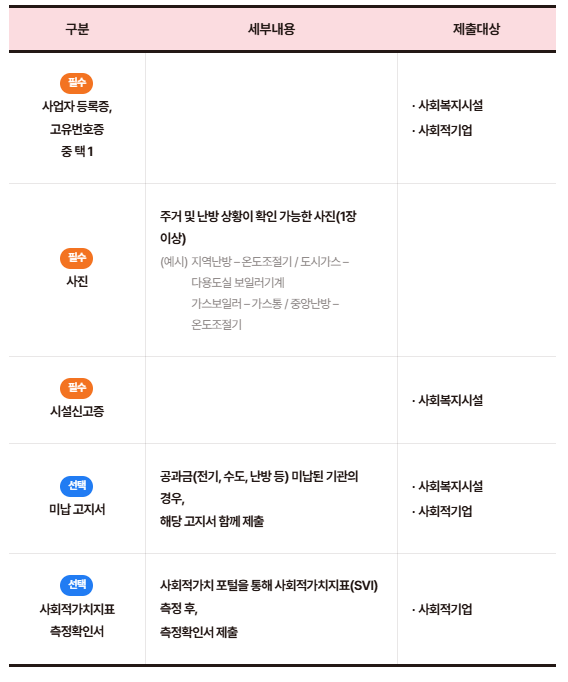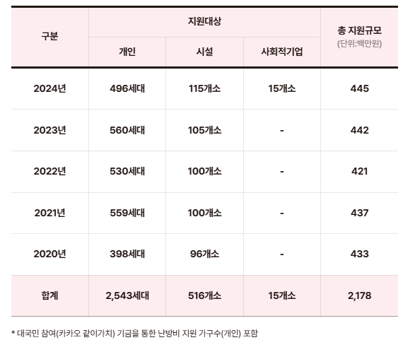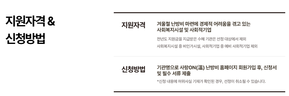 | 지원대상 | 저소득층, 복지시설, 사회적기업 | 전년도 수혜자 제외 |